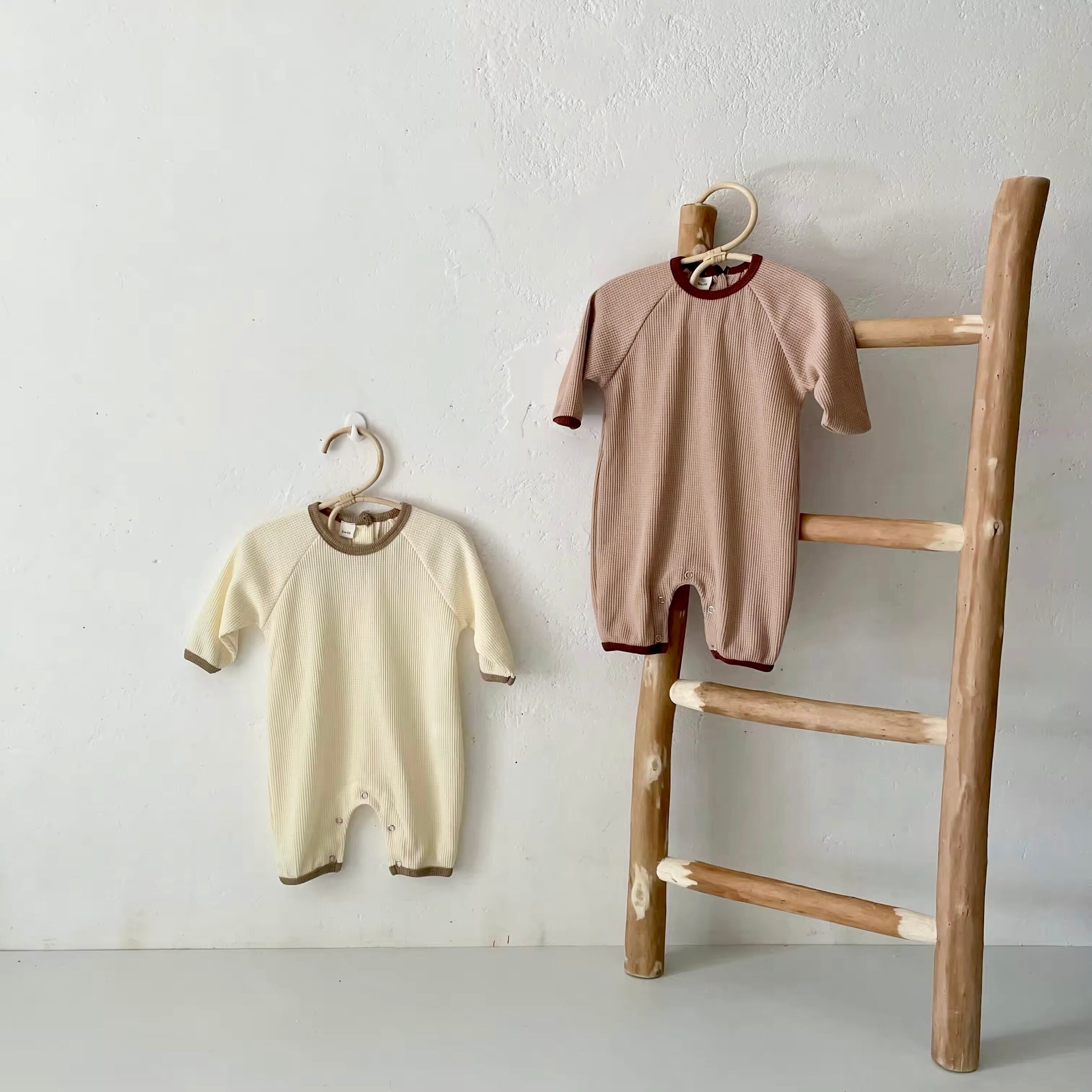 ワッフル生地のバイカラーロンパース